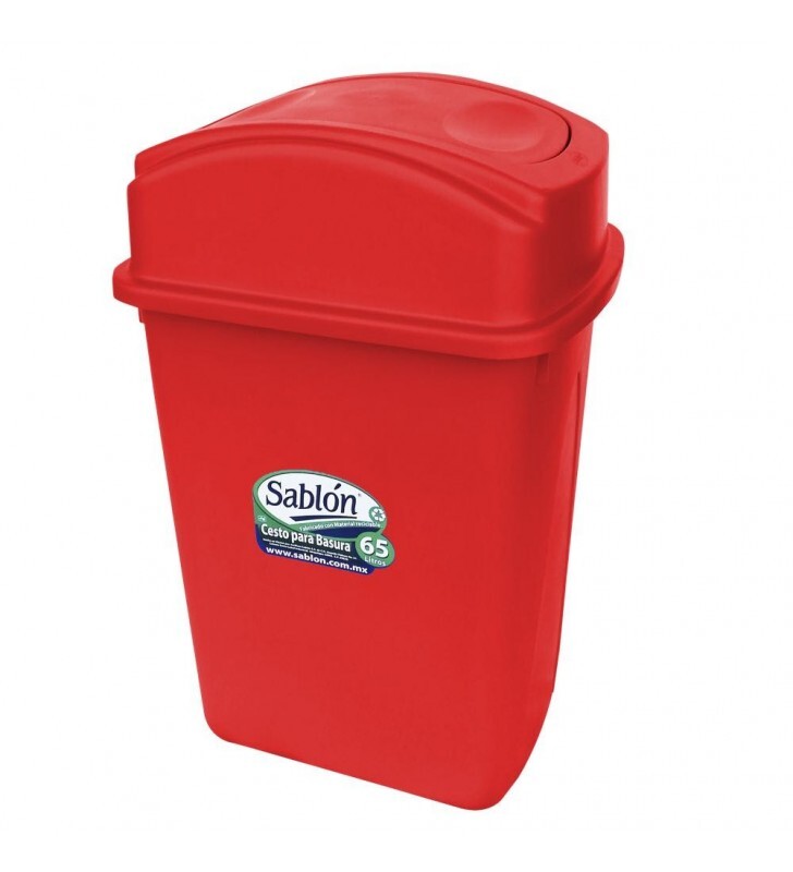 El Bote de Basura Sablón de 65 litros rojo está fabricado con polipropileno copolímero de trabajo pesado, ofreciendo excelente resistencia y durabilidad, ideal para el uso diario.